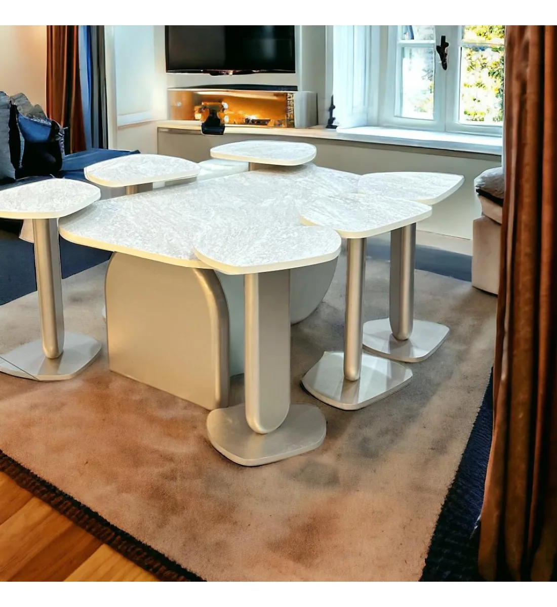 تزخر هذه المجموعة بمزاياها العديدة التي تحثّكِ على اقتنائها، تتضمن ست طاولات جانبية وواحدة بالنص كبيرة لاعتماد أى منهم وقتما تشائين مع الحفاظ على مساحتكِ.