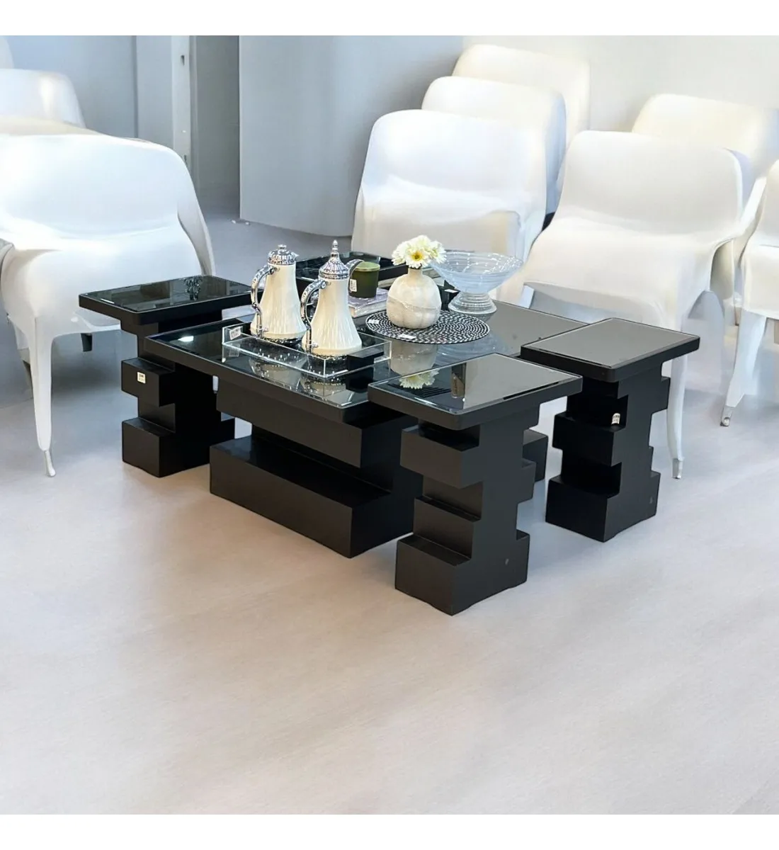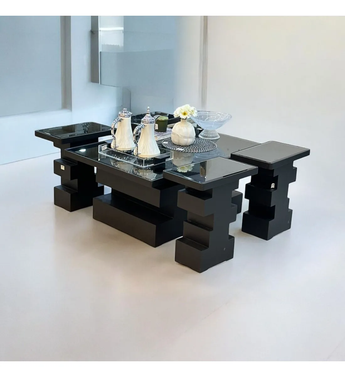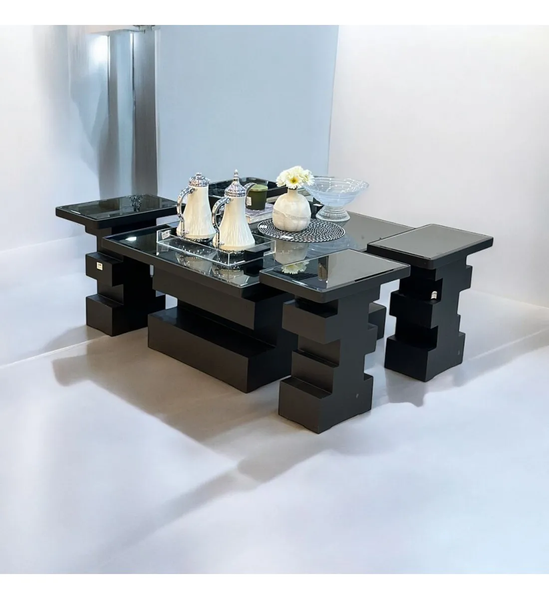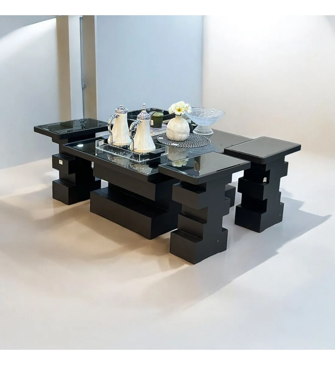 طقم طاولات  5قطع سطح زجاج  قاعده خشب تدريج اسود (المنتج تفصيل)
