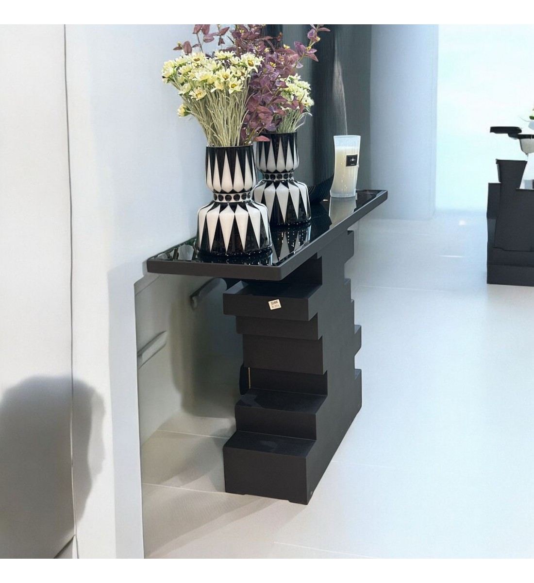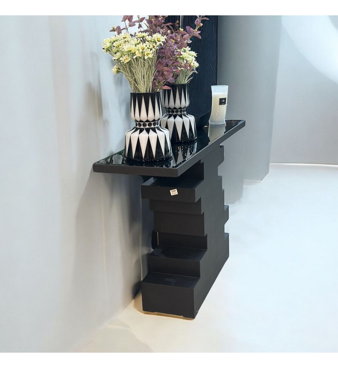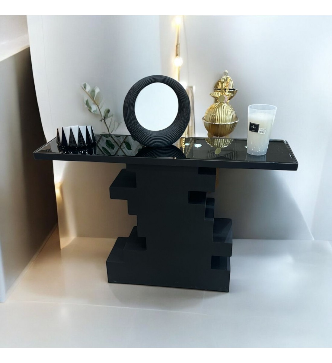 Bohemian table in two colors "black wood and glass top" It features an attractive and simple design that reflects the elegant bohemian character. The top surface of the table is made of high-quality glass, and comes in "black" color, and the base is made of wood with a geometric design.